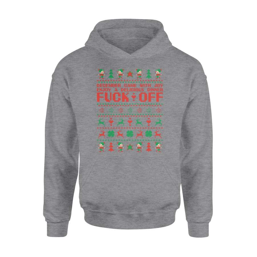 Christmas Gift Idea December Comes With Joy Enjoying Damn Delicious Dinner Next To The Reindeer Goblins And Four Leaf Clover – Standard Hoodie