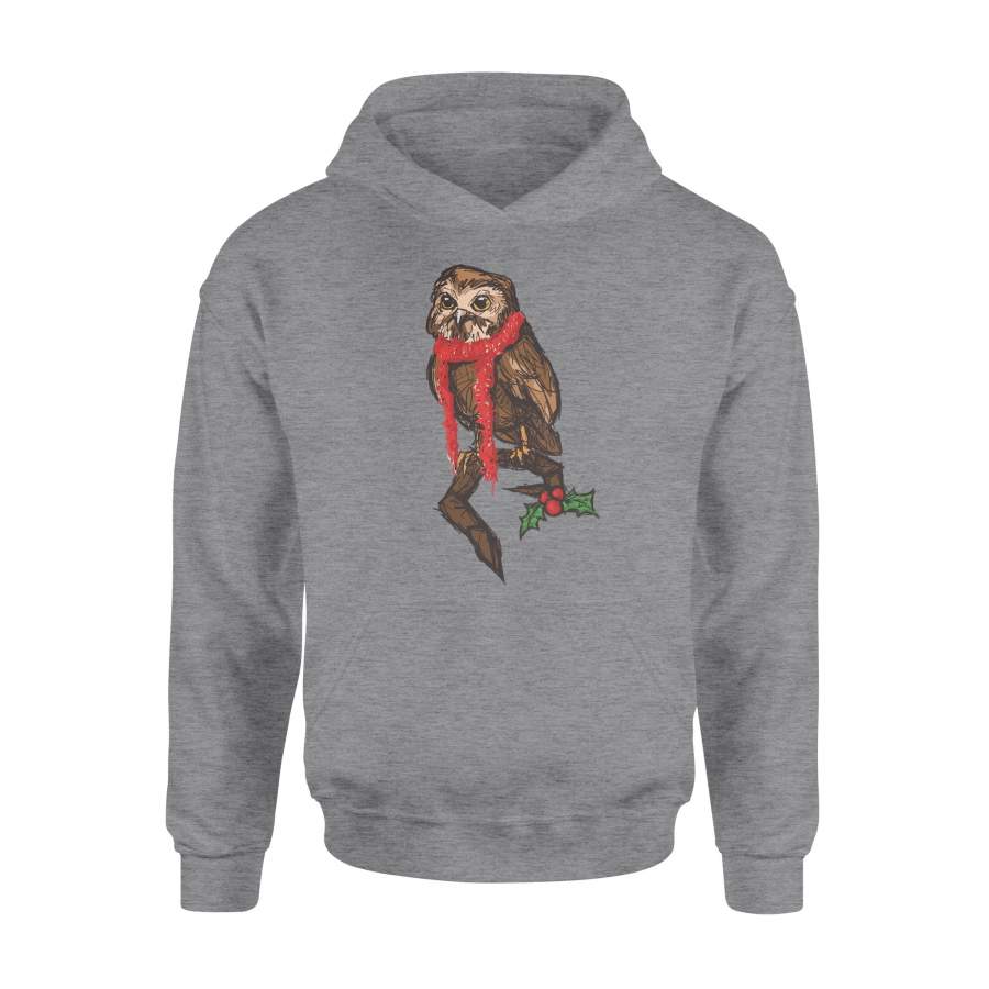 Christmas Gift Idea Owls Wearing Red Scarf Perched On Holly Tree Branches – Standard Hoodie