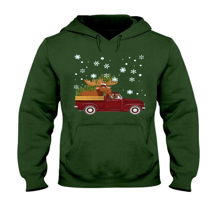 Funny Christmas Moose On Red Truck Christmas Hoodie