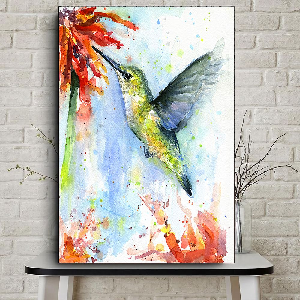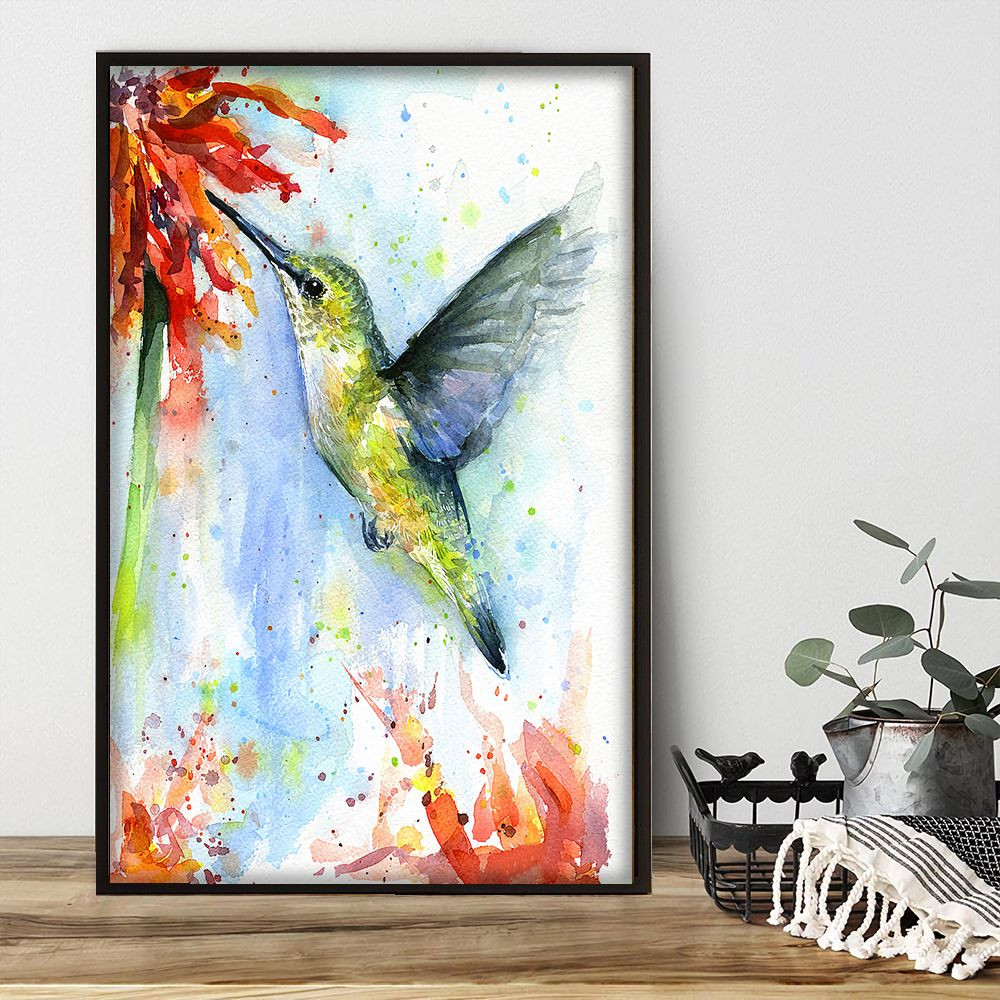 Hummingbird And Red Flower Watercolor Poster & Canvas