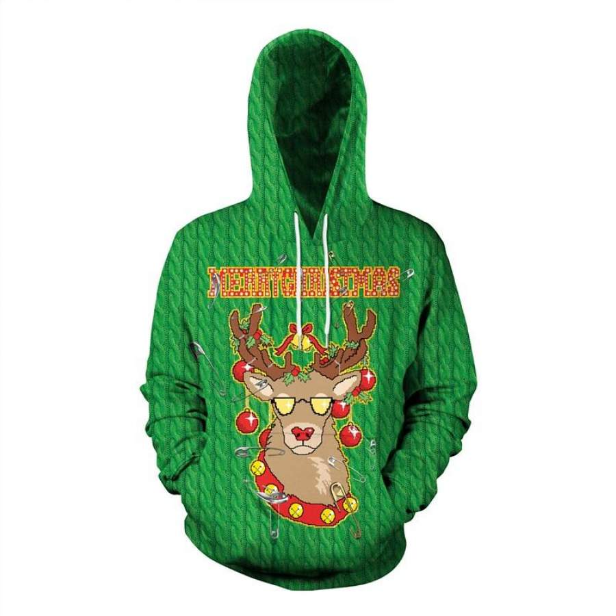Mens Green Hoodies 3D Graphic Printed Merry Christmas Cool Deer Pullover
