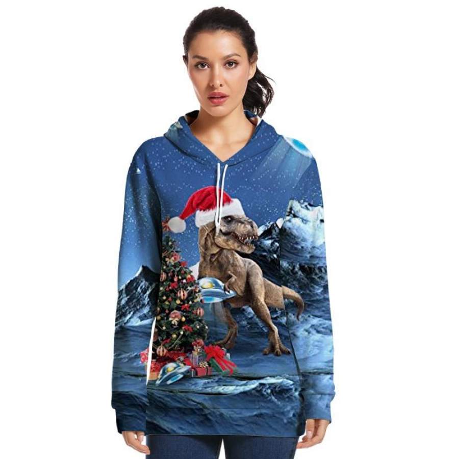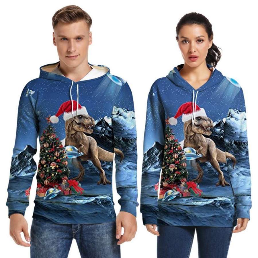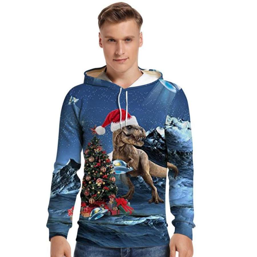 Mens Hoodies 3D Graphic Printed Merry Christmas Dinosaur Blue Pullover Hoodie
