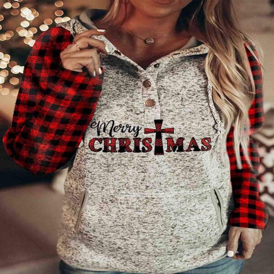 Merry Christmas Print Plaid Splicing Drawstring Hoodies With Button