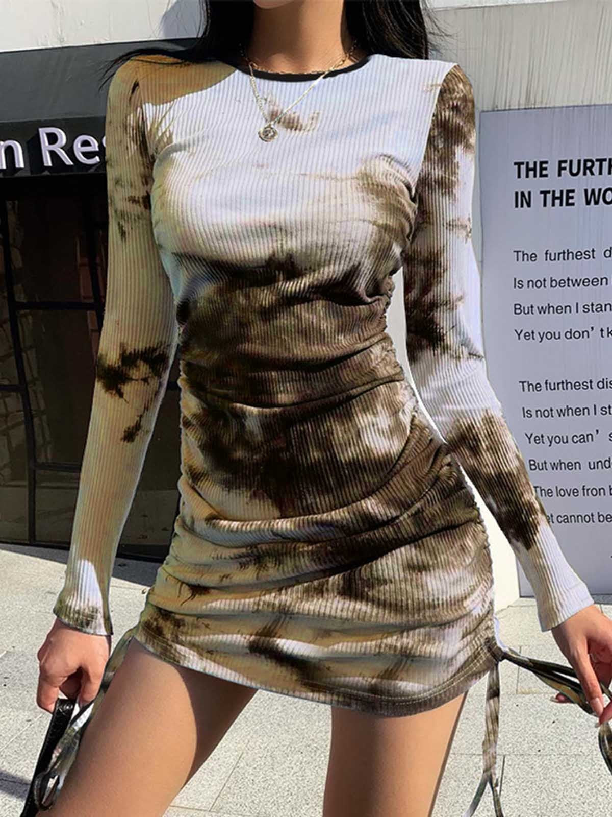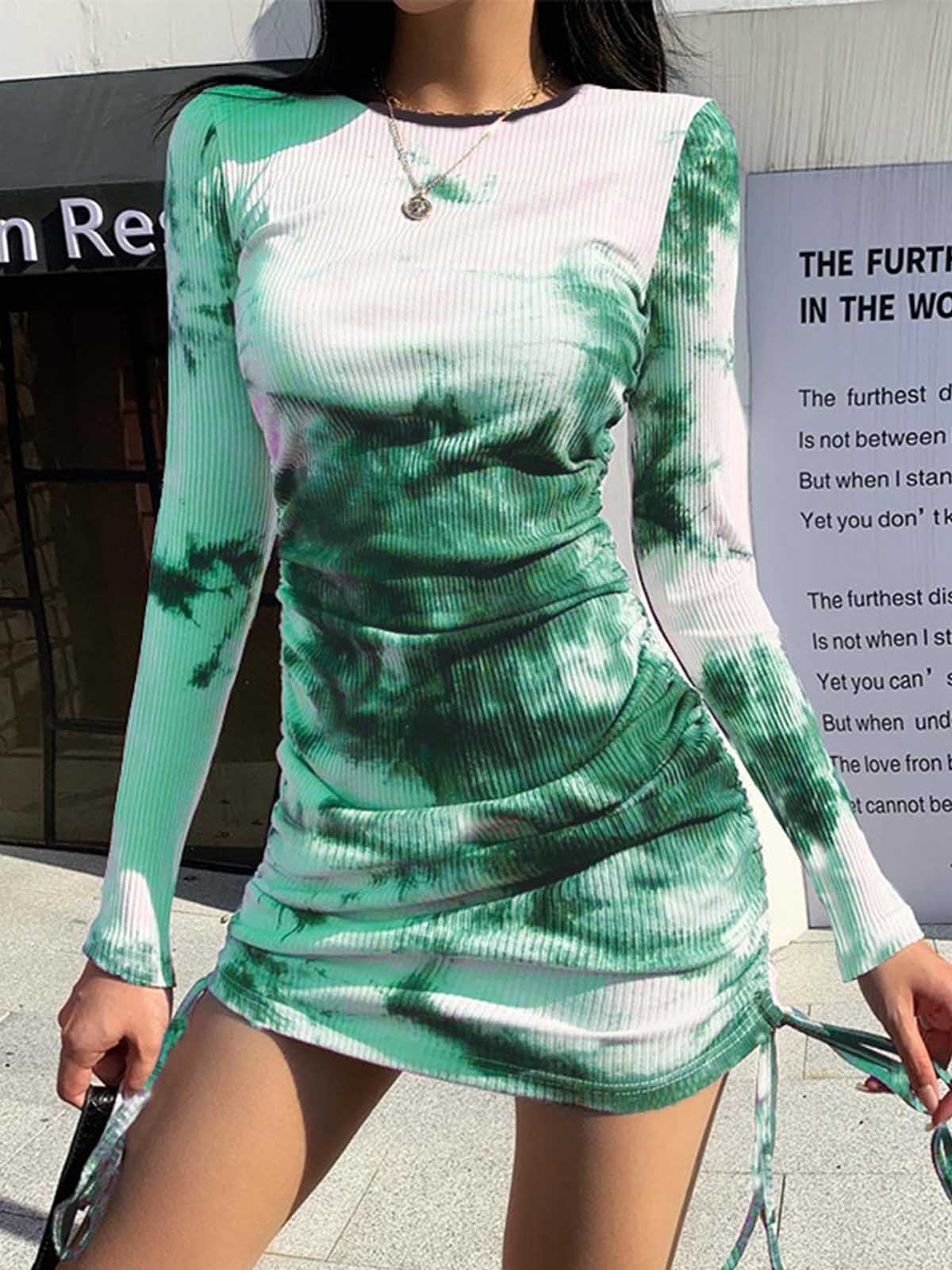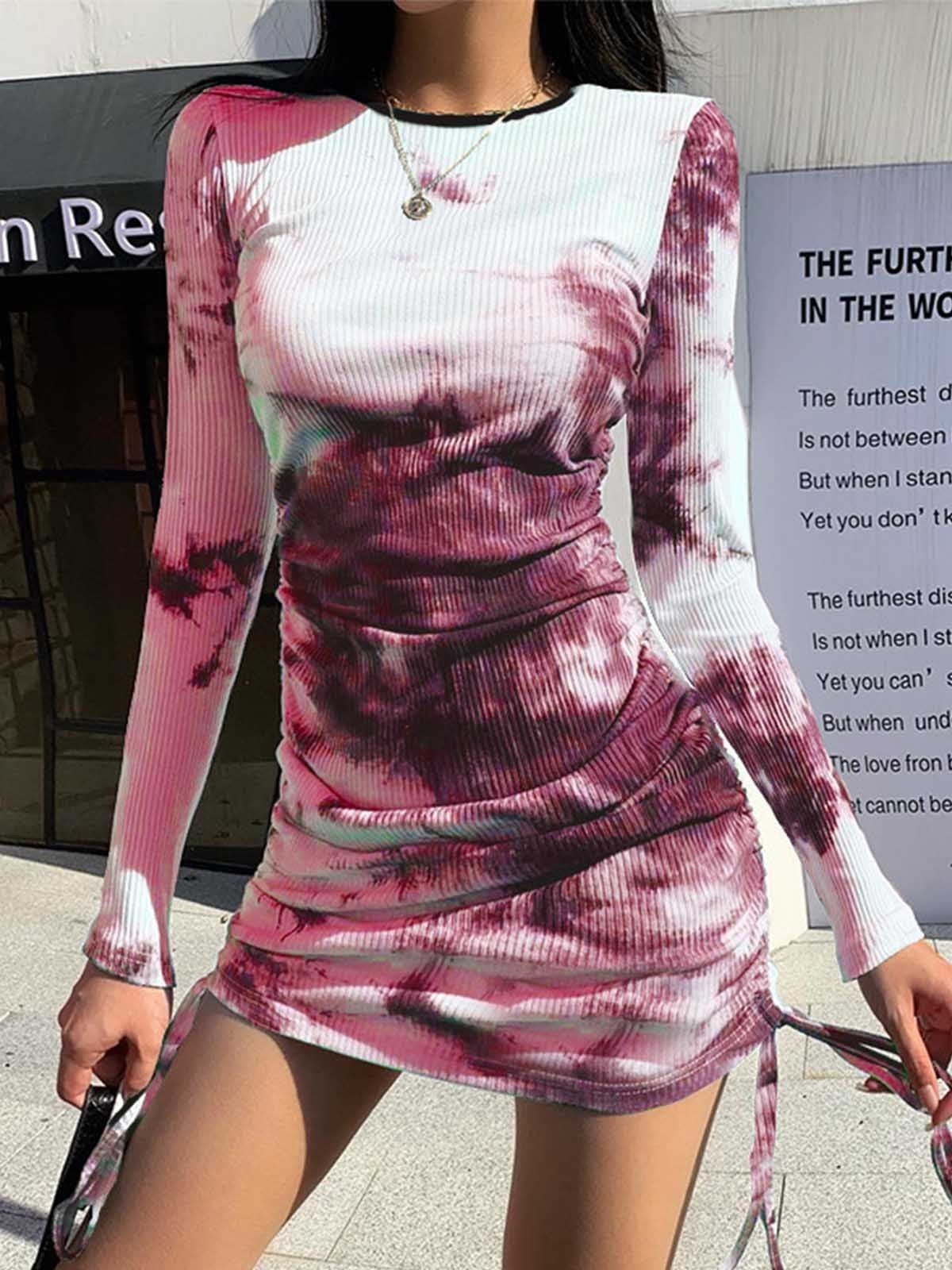 Sexy Slim Fit Tie Dye Print Slim Fit Crew Neck Long Sleeve Gathered Dress