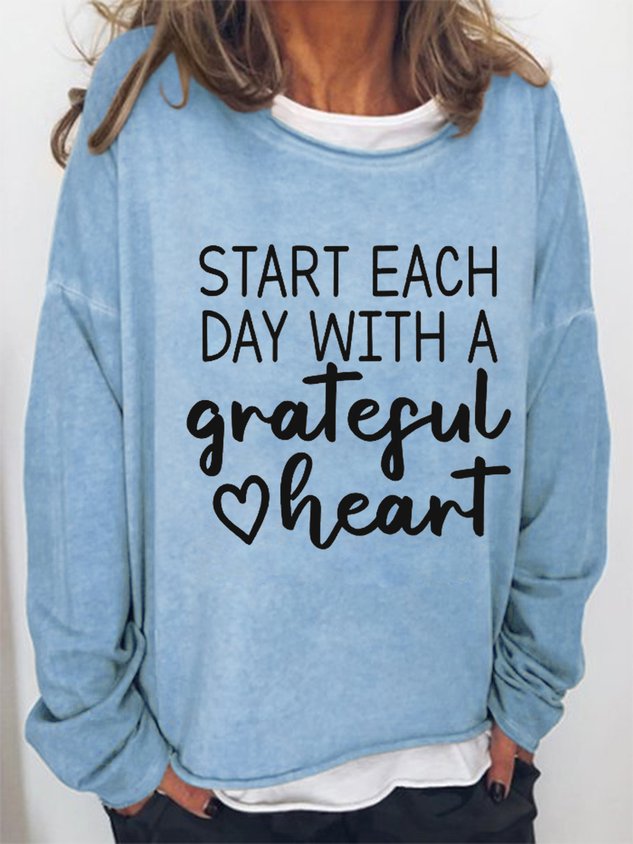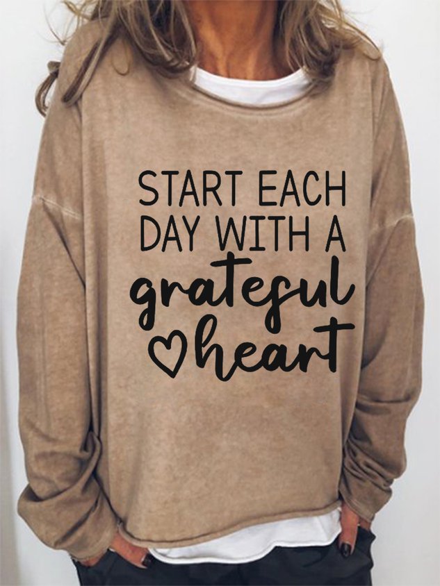 Start Each Day With A Grateful Heart Letter Crew Neck Long Sleeve Top